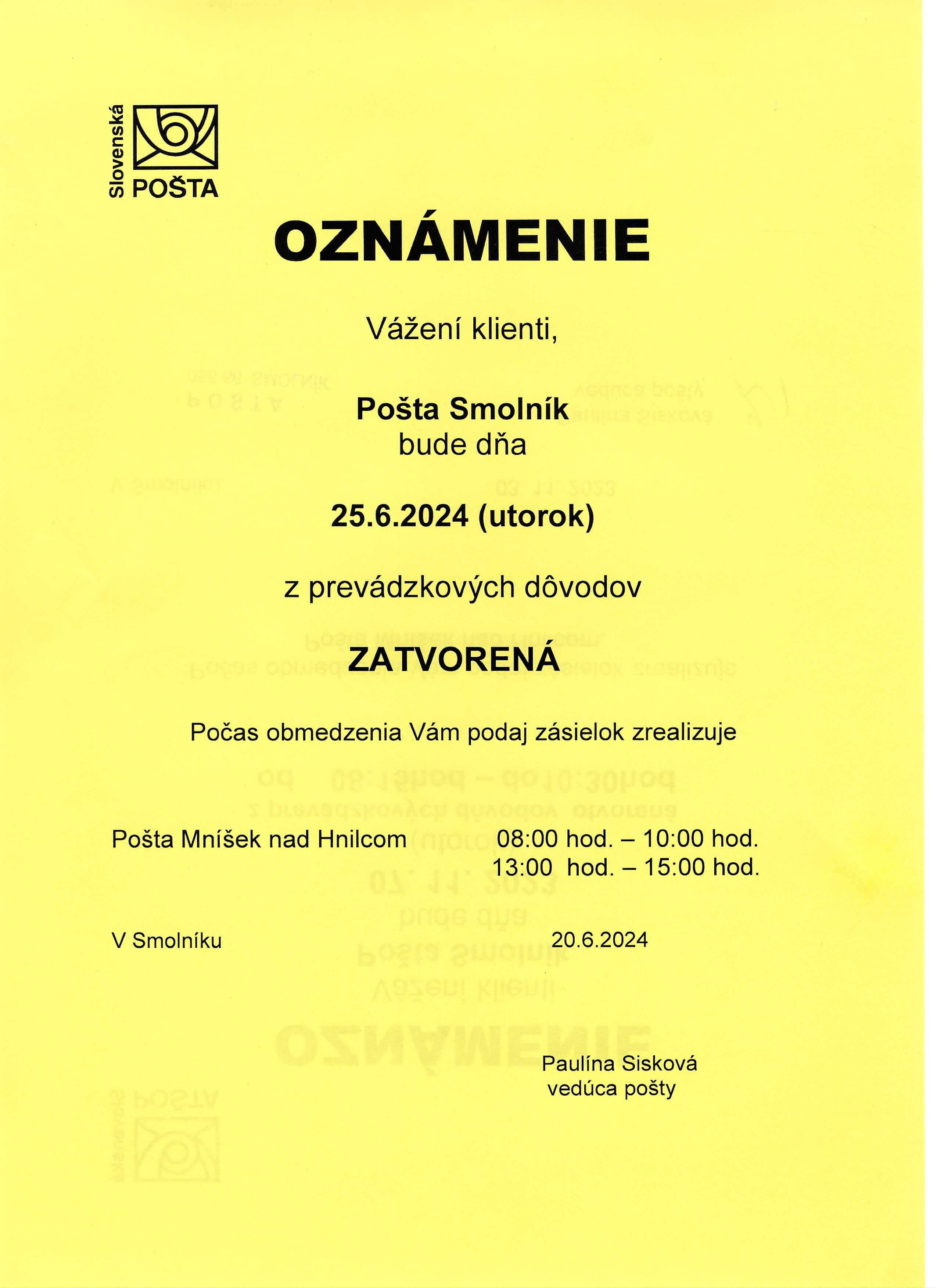 Pošta Smolník - zatvorená 25.6.2024.jpeg Typ: JPEG obrázok, Velkosť: 302.88 kB
